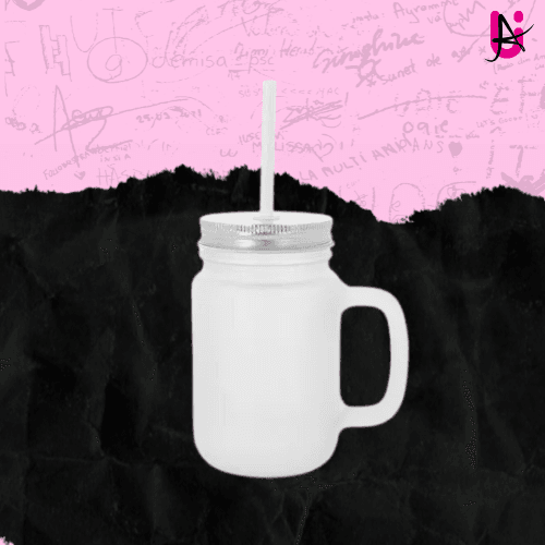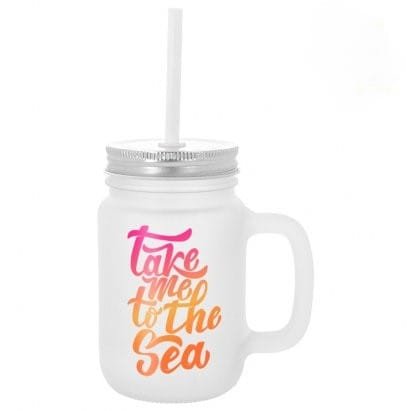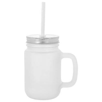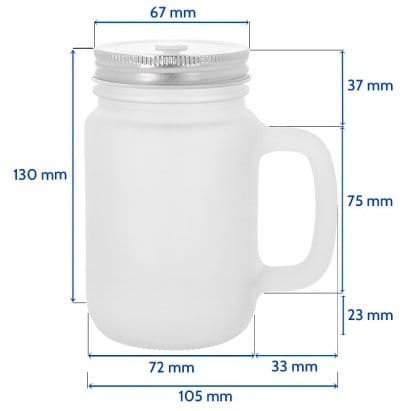 - Tarro con asa similar al tarro de albañil. Diseño clásico y práctico con tapa enroscable de metal y orificio para pajita. Incluye una pajita de plástico rígido blanco.